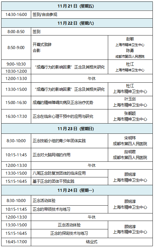 为提高成瘾领域医务工作者、公安及司法戒毒民警、社区戒毒工作人员、心理咨询师的工作能力,上海市精神卫生中心、中国药物滥用防治协会成瘾医学研究专业委员会、成都市第四人民医院于 2025 年11月21日至24日,开展成瘾心理治疗技术培训班——正念防复发治疗。培训内容包括:辩证行为治疗的基础理论、技能训练团体的四大模块教学与针对成瘾人群开展治疗的实践分享,系统学习、体验、使用正念防复发技术。